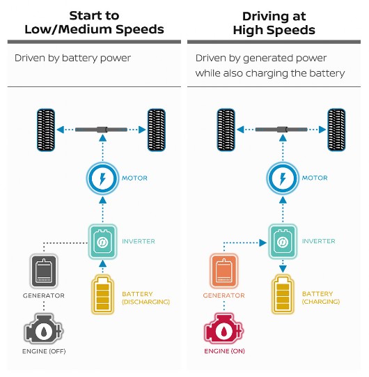 The e-POWER system is comprised of a high-voltage battery and the powertrain, which is integrated with a high-power motor, inverter, gasoline engine, and a generator. In conventional hybrid systems, the wheels are driven by an electric motor and a gasoline engine. However, in the e-POWER system, the wheels are driven by a high-output electric motor like an EV.